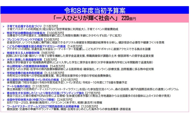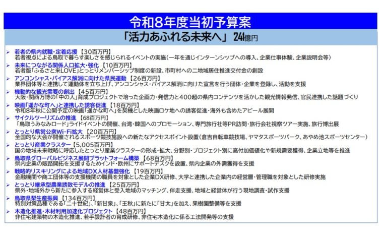 福祉人材や土木・獣医師等の奨学金返還支援、鳥取大学と連携した教員育成・確保、地域限定保育士試験導入、ドクターヘリの運航確保、バンクシーなど県立美術館コレクション整備、来年のワールドマスターズゲームズに向けた準備を進める。