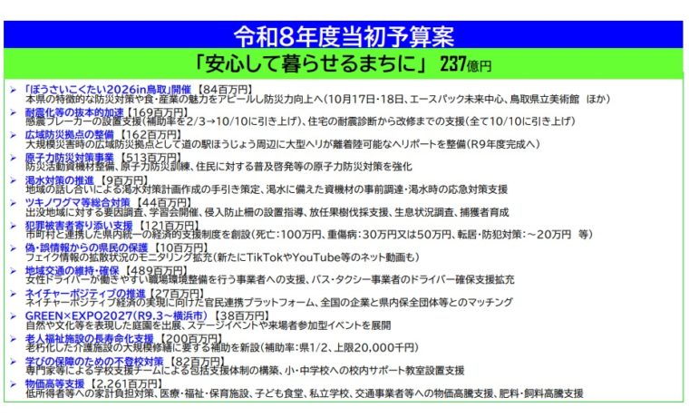 10月「ぼうさいこくたい2026in鳥取」 防災対策や本県の魅力を全国にアピールし、住宅耐震化10割支援を開始、広域防災拠点整備、渇水対策、原子力安全対策など、「ぼうさいとっとり」を力強く推進。